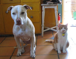 Today Pippin lives with two cats (unbelievable after she would attack every one she saw). She also lives in community with 3 Pit Bulls and a Rottweiler. This is a testament to a dog’s big success in overcoming insecurity. We were able to do this with the proper training, great compassion, and ongoing teaching from Kathy Kear. One thing you should know, YOU HAVE TO DO THE WORK IN ORDER TO BE SUCCESSFUL. It is as much for you, if not more, than for your dog. Your dog NEEDS you! Know that your dog just wants to do right by you.
